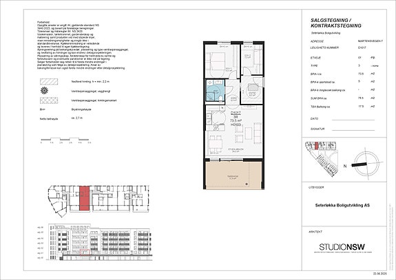 Det blir utstedt energiattest for den enkelte leilighet. Boligens varmetap og energibehov er dimensjonert iht. teknisk forskrift av 2017, TEK 17. Energimerkingen er beregnet til å ligge i kategori A til B. Det tas forbehold for at avvik kan forekomme spesielt i leiligheter med mye vindusflate.