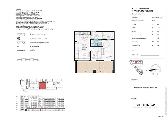 Det blir utstedt energiattest for den enkelte leilighet. Boligens varmetap og energibehov er dimensjonert iht. teknisk forskrift av 2017, TEK 17. Energimerkingen er beregnet til å ligge i kategori A til B. Det tas forbehold for at avvik kan forekomme spesielt i leiligheter med mye vindusflate.