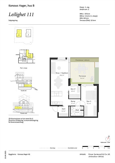 Arealet er beregnet ut fra Norsk standard NS 3940:2023. BRA-i: Internt arealet innenfor boligens omsluttende vegger, inkludert sjakt. BRA-e: Eksternt areal som boligen har eksklusiv bruksrett til, men som ikke ligger i boligen, f.eks. kjellerbod. BRA-b: Areal for innglasset balkong med veggareal. Total BRA = Summen av BRA-i, BRA-e og BRA-b. TBA er areal på terrasse og balkong. Arealet oppgis ved salg, men inngår ikke i BRA. Oppgitt romareal er netto romareal. De oppgitte arealer er å betrakte som cirka-arealer. Partene har ingen krav mot hverandre dersom arealet skulle vise seg å være 5 % mindre / større enn det oppgitte areal.