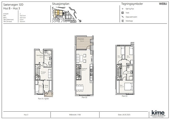 Det er to typer rekkehus; tre etasjers hus med stue og kjøkken i midtplanet, og to etasjers hus med takterrasse og loftstue.