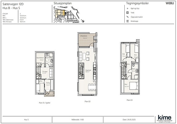 Det er to typer rekkehus; tre etasjers hus med stue og kjøkken i midtplanet, og to etasjers hus med takterrasse og loftstue.