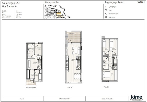 Det er to typer rekkehus; tre etasjers hus med stue og kjøkken i midtplanet, og to etasjers hus med takterrasse og loftstue.
