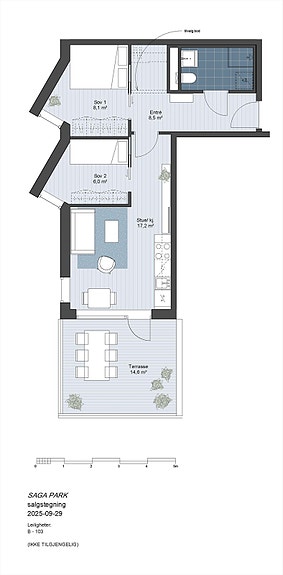 Innbydende 3-roms hjørneleilighet med åpen stue/kjøkken og gode møbleringsmuligheter. Sørvendt terrasse gir fine solforhold og en hyggelig uteplass.