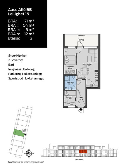 - Hver leilighet har fast parkering og sportsbod i lukket P-anlegg