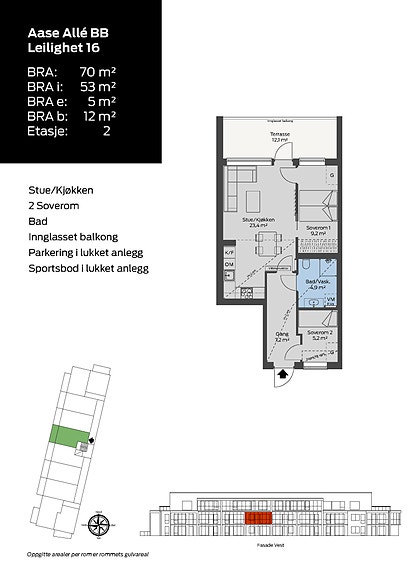 - Hver leilighet har fast parkering og sportsbod i lukket P-anlegg