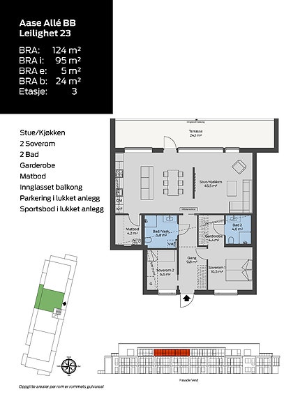 - Hver leilighet har fast parkering og sportsbod i lukket P-anlegg