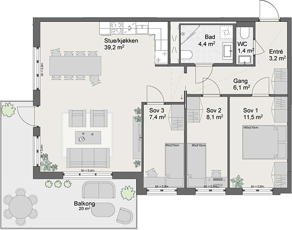 Stor og lys 4-roms hjørneleilighet med store vindusflater og stor balkong. Leiligheten har åpen stue- og kjøkkenløsning med god plass til både spise- og sofagruppe. Tre fine soverom og romslig entré med plass til garderobe. Ekstra WC ved entré. Alle 4-roms leiligheter kan kjøpe parkeringsplass til kr 675 000.
