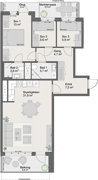 Fin 4-roms leilighet med åpen stue- og kjøkkenløsning med god plass til både spise- og sofagruppe. Fra stue har du utgang ut til balkong. Tre fine soverom, hvorav hovedsoverom har eget bad og utgang til uteplass. Romslig entré/gang med god plass til garderobe. Alle 4-roms leiligheter kan kjøpe parkeringsplass til kr 675 000.
