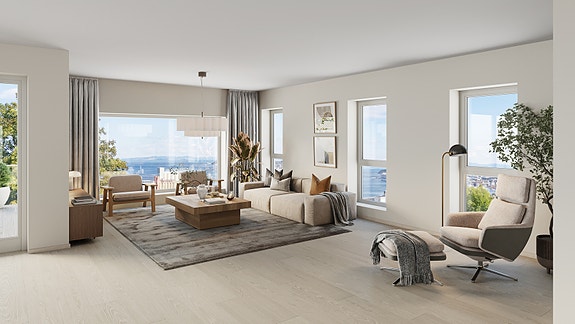 - Gjennomgående lys og moderne materialvalg som gir et eksklusivt preg.
