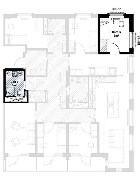 Stuene er plassert mot gårdsrommet og har tilgang til felles balkong. Det legges til rette for TV-titting og sofaaktiviteter. Nøkkelord for dette rommet er fleksibilitet - både muligheten for å samles mange, som ved fest eller for å se på TV sammen, men også muligheten til å finne ro når andre oppholder seg på kjøkkenet.