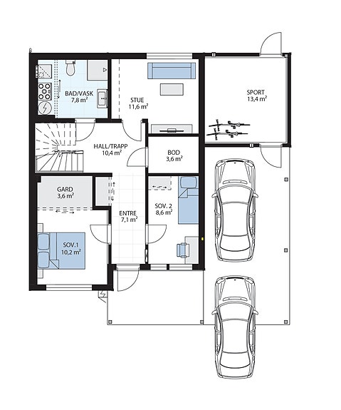 1. etasje: Entré, hall/trapp, stue, 2 soverom, bad/vaskerom og bod. Carport og sportsbod.