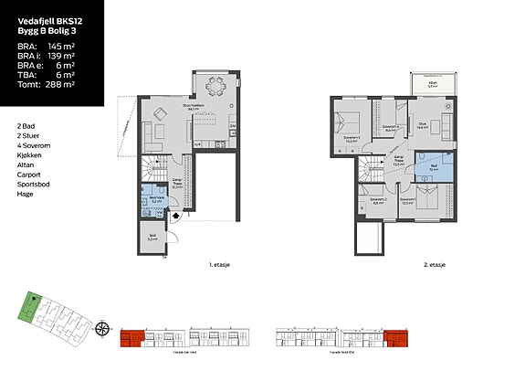 Delfelt BKS12 består av to rekker - A og B - med tre hus i hver. Det betyr at fire av seks boliger er enderekkehus. Ellers er husene like både utenpå og inni når det gjelder antall rom og plassering. Også når det gjelder størrelse er de så godt som like.