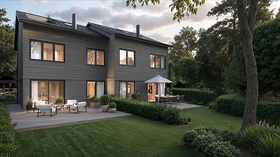 Dataanimerte illustrasjoner er kun ment som en illustrasjon. Leveransen kan avvike fra dette både når det gjelder detaljer, materialvalg og farger. Illustrasjonene viser forslag til platting og pergola som ikke leveres, men kan velges I forbindelse med tilvalgsprosessen.