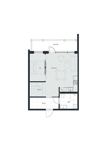 Leilighet i 2. etg. på 51 m2 BRA-i med 1 soverom, sovealkove, 1 bad og oppholdsrom med utgang til veranda. Utstyrsbod på ca. 5 m2 BRA-e i forbindelse med parkeringskjeller. I tillegg vil det være felles rom for sykkeloppbevaring. Parkering i carport.
