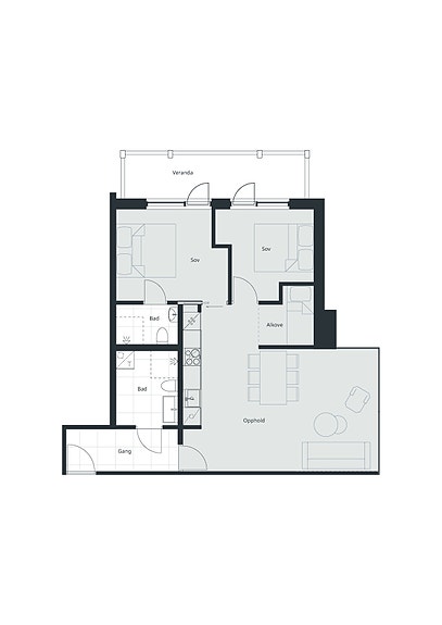 Hjørneleilighet i 2. etg. på 70m2 BRA-i med 2 soverom, sovealkove, 1 bad og stort nisjeoppholdsrom med utgang til veranda. Utstyrsbod på ca. 5 m2 BRA-e i forbindelse med parkeringskjeller. Muligheter for ekstra bad som tilvalg. I tillegg vil det være felles rom for sykkeloppbevaring. Parkering i carport.