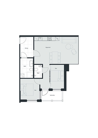 Hjørneleilighet i 2. etg. på 66 m2 BRA-i med 2 soverom, sovealkove, 1 bad og stort nisjeoppholdsrom med utgang til veranda. Utstyrsbod på ca. 5 m2 BRA-e i forbindelse med parkeringskjeller. I tillegg vil det være felles rom for sykkeloppbevaring. Parkering i carport. Mulighet for å bygge om alkove til bad som tilvalg.
