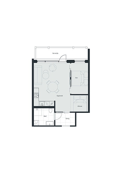 Leilighet i 3. etg. på 48 m2 BRA-i med 1 soverom, sovealkove, 1 bad og oppholdsrom med utgang til veranda. Utstyrsbod på ca. 2,5 m2 BRA-e i forbindelse med parkeringskjeller. I tillegg vil det være felles rom for sykkeloppbevaring. Parkering i carport.