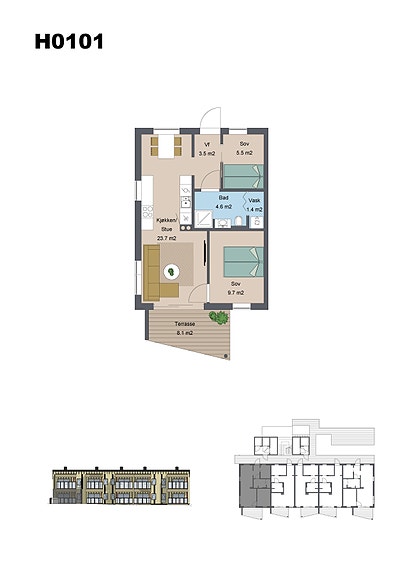 Prosjektet består av 10 leiligheter i to ulike størrelser. De minste leilighetene har et totalt bruksareal på 42 kvm og byr på en effektiv planløsning med stue og kjøkken i åpen løsning, soverom, bad, garderobe og vindfang. I tillegg medfølger praktisk utvendig bod. De største leilighetene er på 56 kvm og har to soverom. Alle leiligheter leveres med flislagt bad og balansert ventilasjon som bidrar til et godt og behagelig inneklima. Det blir klartgjort for elbil-lader med trekkerør.