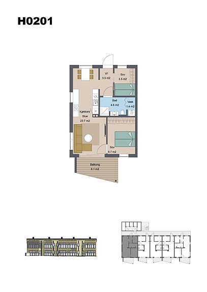 Prosjektet består av 10 leiligheter i to ulike størrelser. De minste leilighetene har et totalt bruksareal på 42 kvm og byr på en effektiv planløsning med stue og kjøkken i åpen løsning, soverom, bad, garderobe og vindfang. I tillegg medfølger praktisk utvendig bod. De største leilighetene er på 56 kvm og har to soverom. Alle leiligheter leveres med flislagt bad og balansert ventilasjon som bidrar til et godt og behagelig inneklima. Det blir klartgjort for elbil-lader med trekkerør.
