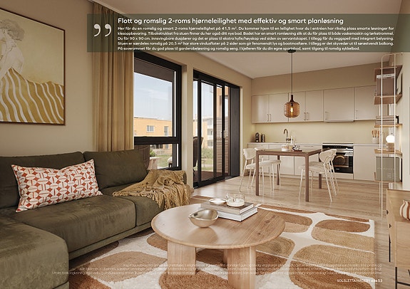 Her får du en romslig og smart 2-roms hjørneleilighet på 41,5 m2. Du kommer hjem til en leilighet hvor du i entréen har rikelig plass smarte løsninger for klesoppbevaring. Tilbaketrukket fra stuen finner du her også ditt nye bad. Badet har en smart romløsning slik at du får plass til både vaskemaskin og tørketrommel. Du får 90 x 90 cm. innsvingbare dusjdører og det er plass til ekstra hylle/høyskap ved siden av servantskapet. I tillegg får du veggspeil med integrert belysning. Stuen er særdeles romslig på 20,5 m2 har store vindusflater på 2 sider som gir fenomenalt lys og boatmosfære. I tillegg er det skyvedør ut til sørøstvendt balkong. På soverommet får du god plass til garderobeløsning og romslig seng. I kjelleren får du din egne sportsbod, samt tilgang til romslig sykkelbod.