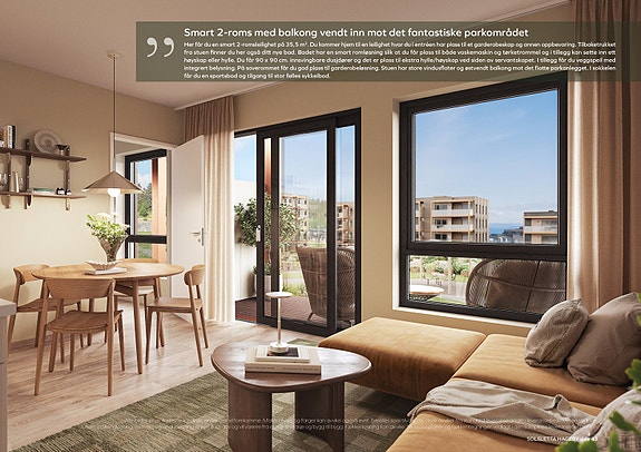 Her får du en smart 2-romsleilighet på 35,5 m2. Du kommer hjem til en leilighet hvor du i entréen har plass til et garderobeskap og annen oppbevaring. Tilbaketrukket fra stuen finner du her også ditt nye bad. Badet har en smart romløsning slik at du får plass til både vaskemaskin og tørketrommel og i tillegg kan sette inn ett høyskap eller hylle. Du får 90 x 90 cm. innsvingbare dusjdører og det er plass til ekstra hylle/høyskap ved siden av servantskapet. I tillegg får du veggspeil med integrert belysning. På soverommet får du god plass til garderobeløsning. Stuen har store vindusflater og østvendt balkong mot det flotte parkanlegget. I sokkelen får du en sportsbod og tilgang til stor felles sykkelbod.