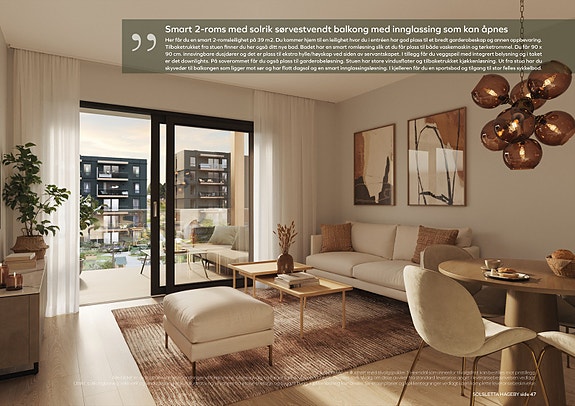 Her får du en smart 2-romsleilighet på 39 m2. Du kommer hjem til en leilighet hvor du i entréen har god plass til et bredt garderobeskap og annen oppbevaring. Tilbaketrukket fra stuen finner du her også ditt nye bad. Badet har en smart romløsning slik at du får plass til både vaskemaskin og tørketrommel. Du får 90 x 90 cm. innsvingbare dusjdører og det er plass til ekstra hylle/høyskap ved siden av servantskapet. I tillegg får du veggspeil med integrert belysning og i taket er det downlights. På soverommet får du også plass til garderobeløsning. Stuen har store vindusflater og tilbaketrukket kjøkkenløsning. Ut fra stua har du skyvedør til balkongen som ligger mot sør og har flott dagsol og en smart innglassingsløsning. I kjelleren får du en sportsbod og tilgang til stor felles sykkelbod.