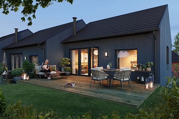 Boligene er mørkeblå. De er innfelt i terrenget og har to etasjer ved inngangspartiet og en etasje mot nabo i vest.