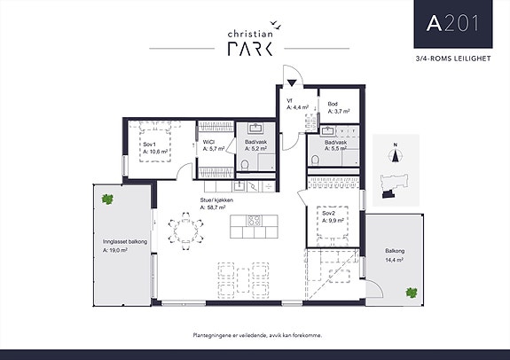 i bakgårdshagen hvor man kan nyte morgen- og formiddagssola i fredelige omgivelser med parken som nærmeste nabo. Mot vest har leiligheten en stor innglasset balkong som ligger luftig og solrikt da A201 vil ligge i 3. etasje fra gårdsplassen. Leiligheten har to gode soverom og to bad, en romslig stue/kjøkkenløsning som er innredet slik at man enkelt kan etablere et ekstra gjesterom/tv-stue. Hovedsoverommet har eget garderoberom og bad, mens gjestebadet ligger i tilknytning til entré. Leiligheten har godt med garderobeplass i tillegg til en praktisk bod i entré.