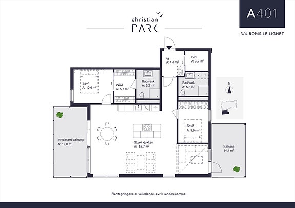 Gjennomgående flott endeleilighet med uteplasser på begge sider. Skjermet balkong som vender inn i bakgårdshagen hvor man kan nyte morgen- og formiddagssola i fredelige omgivelser med parken som nærmeste nabo. Mot vest har leiligheten en stor innglasset balkong som vil fungere som ekstra stue gjennom deler av året. Leiligheten ligger høyt og fint med utsikt mot sentrum omkringliggende områder. Leiligheten har to gode soverom og to bad, en romslig stue/kjøkkenløsning som er innredet slik at man enkelt kan dele av til et ekstra gjesterom/tv-stue. Hovedsoverommet har eget garderoberom og bad, mens gjestebadet ligger i tilknytning til entré. Leiligheten har godt med garderobeplass i tillegg til en praktisk bod i entré.