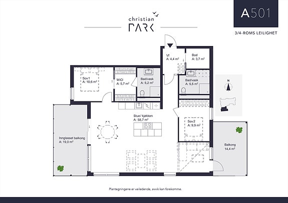 Gjennomgående spennende endeleilighet med uteplasser på to sider og hvor man får lysinnfall fra tre himmelretninger. Skjermet balkong som vender inn i bakgårdshagen hvor man kan nyte morgen- og formiddagssola i fredelige omgivelser med parken som nærmeste nabo. Mot vest har leiligheten en stor innglasset balkong som har sola til sene kveldstimer. Leiligheten ligger i 6. etasje fra gårdsplassen som gir fin utsikt over sentrum og områdene rundt. Leiligheten har to gode soverom og to bad, en romslig stue/kjøkkenløsning som er innredet slik at man enkelt kan dele av til et ekstra gjesterom/tv-stue. Hovedsoverommet har eget garderoberom og bad, mens gjestebadet ligger i tilknytning til entré. Leiligheten har godt med garderobeplass i tillegg til en praktisk bod i entré.