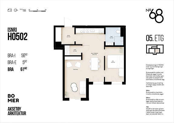 No68 kombinerer klassisk bygårdskarakter med moderne løsninger og god arealutnyttelse. Leilighetene får funksjonelle planløsninger, tidsriktige materialvalg og rikelig naturlig lys fra store vindusflater. Det er lagt vekt på kvalitet og komfort i både planlegging og utførelse, slik at boligene skal være lettstelte, praktiske og tilpasningsdyktige for ulike livssituasjoner.