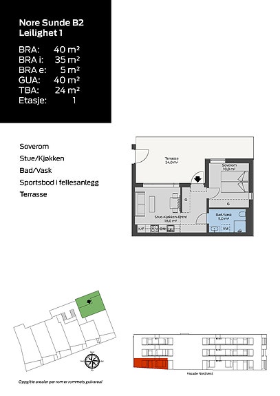 Delfelt B2 er navnet på den siste av de to planlagte blokkene på Nore Sunde. 20 finfine muligheter for førstegangskjøperen eller du som vil ha litt mindre plass og mye enklere hverdager: Leiligheter fra 32 til 70 kvadratmeter fordelt på tre etasjer. Du kan velge om du vil ha ett eller to soverom, og om du vil ha markterrasse eller en lettstelt balkong. Eget vaskerom? Det kan du også få, hvis du vil. Leilighetene er lyse og moderne. Terrasser og balkonger vender alle sammen mot sør, bortsett fra leilighet 1 og 8 som har uteplassen sin andre veien.