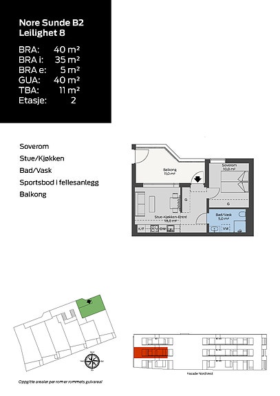 Delfelt B2 er navnet på den siste av de to planlagte blokkene på Nore Sunde. 20 finfine muligheter for førstegangskjøperen eller du som vil ha litt mindre plass og mye enklere hverdager: Leiligheter fra 32 til 70 kvadratmeter fordelt på tre etasjer. Du kan velge om du vil ha ett eller to soverom, og om du vil ha markterrasse eller en lettstelt balkong. Eget vaskerom? Det kan du også få, hvis du vil. Leilighetene er lyse og moderne. Terrasser og balkonger vender alle sammen mot sør, bortsett fra leilighet 1 og 8 som har uteplassen sin andre veien.