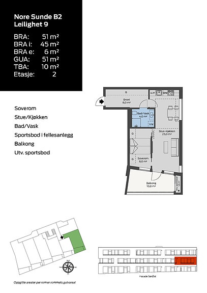 Delfelt B2 er navnet på den siste av de to planlagte blokkene på Nore Sunde. 20 finfine muligheter for førstegangskjøperen eller du som vil ha litt mindre plass og mye enklere hverdager: Leiligheter fra 32 til 70 kvadratmeter fordelt på tre etasjer. Du kan velge om du vil ha ett eller to soverom, og om du vil ha markterrasse eller en lettstelt balkong. Eget vaskerom? Det kan du også få, hvis du vil. Leilighetene er lyse og moderne. Terrasser og balkonger vender alle sammen mot sør, bortsett fra leilighet 1 og 8 som har uteplassen sin andre veien.