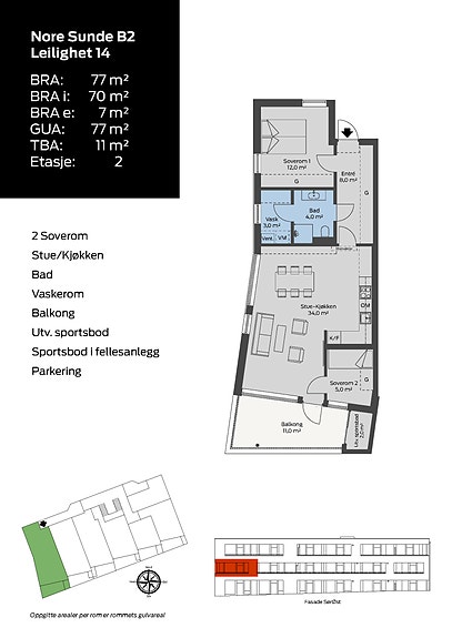Delfelt B2 er navnet på den siste av de to planlagte blokkene på Nore Sunde. 20 finfine muligheter for førstegangskjøperen eller du som vil ha litt mindre plass og mye enklere hverdager: Leiligheter fra 32 til 70 kvadratmeter fordelt på tre etasjer. Du kan velge om du vil ha ett eller to soverom, og om du vil ha markterrasse eller en lettstelt balkong. Eget vaskerom? Det kan du også få, hvis du vil. Leilighetene er lyse og moderne. Terrasser og balkonger vender alle sammen mot sør, bortsett fra leilighet 1 og 8 som har uteplassen sin andre veien.