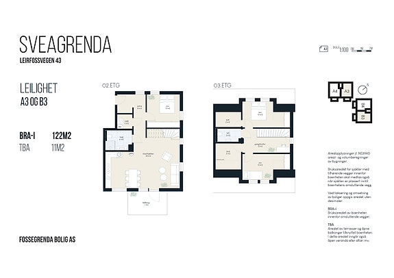 Arealene som er oppgitt er bruksareal (BRA-I og BRA-E) i henhold til NS 3940, som er leilighetens areal innvendig målt ved leilighetens omsluttede vegger, inklusive innvendige vegger, boder og sjakter, men ikke medregnet yttervegger. Det tas forbehold om at mindre arealavvik kan forekomme.