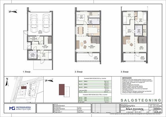 Prosjektet består av tre boliger av Boligtype A, en stilren og funksjonell bolig over tre plan med gjennomtenkt planløsning og kvalitetsmaterialer som gir et moderne og behagelig hjem. Med ca. 182 m² bruksareal får du god plass til hele familien, og løsninger som dekker både dagens og morgendagens behov - enten du ønsker åpne fellesarealer, privatliv eller fleksibilitet til hjemmekontor og hobbyaktiviteter.