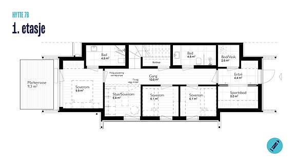 Eksklusiv fjellhytte med 3 soverom (5 mulig), 2 bad, vaskerom, 2 stuer, åpen kjøkkenløsning, terrasse, 2 balkonger, sportsbod, generøse vindusflater og god takhøyde.
