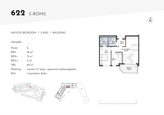 Utleieplikt. Stue med åpen kjøkkenløsning og utgang til balkong, 2 soverom og 2 bad.