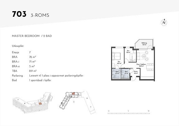 Utleieplikt. Stue med åpen kjøkkenløsning og utgang til balkong, 2 soverom og 2 bad.