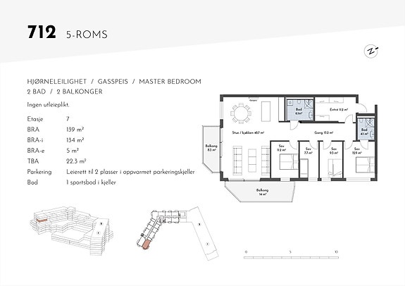 Leilighet 712 5-roms hjørneleilighet med gasspeis, 2 balkonger og 2 bad