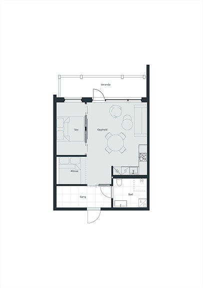 Leilighet i 3. etg. på 51 m2 BRA-i med 1 soverom, sovealkove, 1 bad og oppholdsrom med utgang til veranda. Utstyrsbod på ca. 2,5 m2 BRA-i i forbindelse med parkeringskjeller. Leiligheten ligger i leilighetsbygg "Skogshorn".