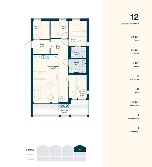 Leilighet nummer 12 er en innholdsrik topp- og hjørneleilighet med 4 soverom, 2 bad, en romslig gang/hall og et luftig allrom med kjøkken/stue, peis og utgang til stor overbygd terrasse. Det medfølger i videre en ekstern sportsbod med plass for alt utstyret, og parkering av bil i carport.
