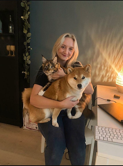 Jeg har to firbeinte familiemedlemmer som følger med meg: Kiara, en snill og stille Shiba-tispe på 3 år.