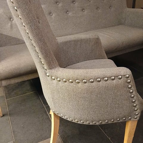 Meget pen stol med håndtak i krom i ryggen. Stolen har stått mest til pynt og er derfor lite brukt. Den har ingen merker eller flekker. Kjøpt hos TM design.