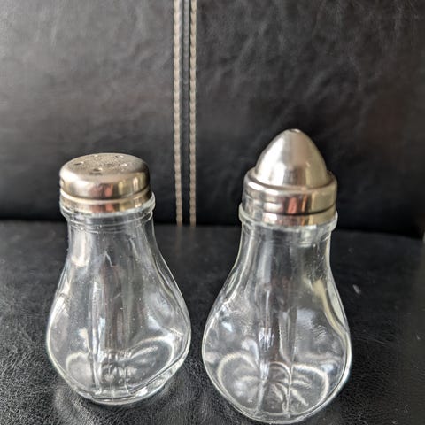 Fint kryddersett i typisk art nouveau stil.bestående tre glassdeler i metall? stativ. Alle glassdeler hele og pene uten skår. Originale.