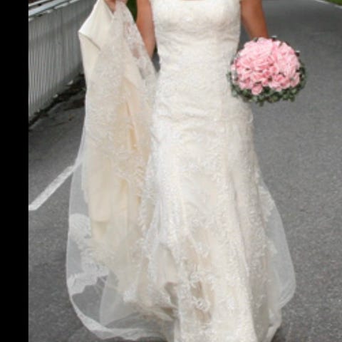 Underkjolen er i silke. Kjolen er skreddersydd/ tilpasset hos Majorstua SyStudio (https://www.systudio.no/home) og renset hos allRens på Skjetten senter (www.allrens.no, anbefalt og spesialist på rens av brudekjoler). Det er mulig å gjøre endringer i frontpartiet (bryst/ skuldre etc). Kjolen kan dessuten fint sys inn i livet, i ryggen og i lengden.