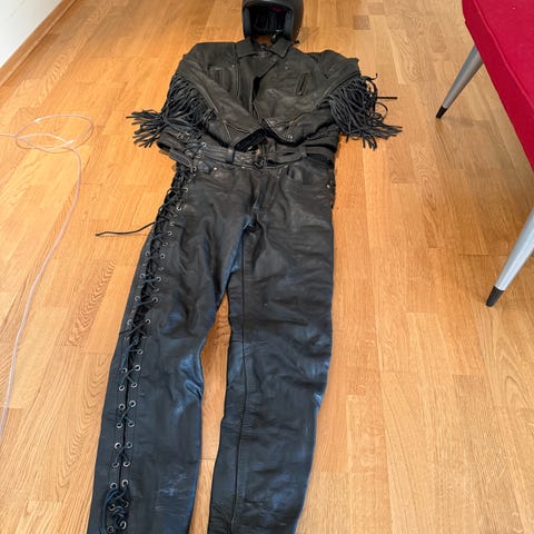 Harley Davidson skinnjakke, støvler og 2 stk hjelmer og en Sissybar veske selges