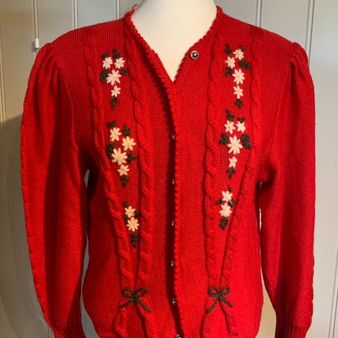 Lekker, dyprød.. . Brukt få , få ganger. Like pen. Fra 1998-2000 ? Fra Sondre. 80 prosent ull. Flotte detaljer. Fin til skjørt,bunad og bukse. Lengre bak. Kjøper betaler porto.