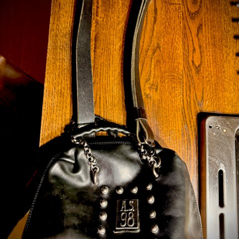 Stor Studio Molund clutch i skinn foret med semsket skinn selges fordi jeg har for mange vesker. Den er kjøpt i Bygdøy Allé. Den er ikke brukt men har fått noen sorte flekker på utsiden på det grå blå skinnet. Jeg har prøvd å rense den med viskelær og med skinnrens og har fått bort noe. Mulig skinnet kan farges over flekkene slik at de ikke synes eller prøve annen skinnrens. Mål 18cm x 33cm